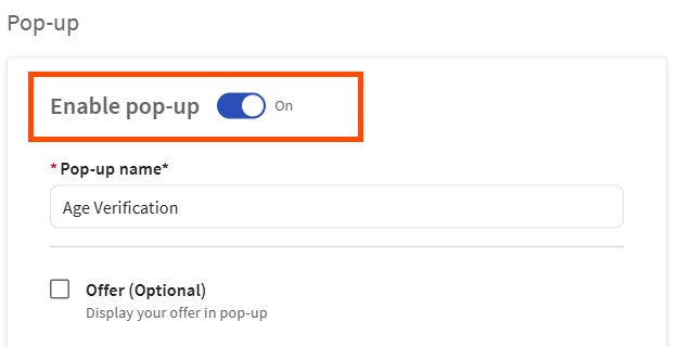 Enable the Age Verification pop-up window by toggling the Enable pop-up setting to the on position. From the pop-up window page, you'll be able to configure its layout, content, placement, visibility, how it appears on the page, and how it closes.