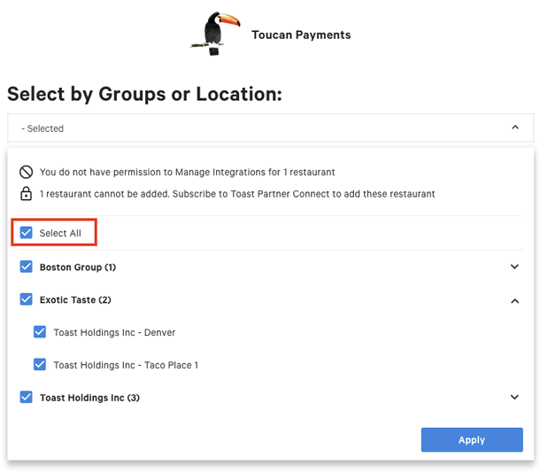 If your restaurant group has more than one location, you can add integrations to multiple locations at once.