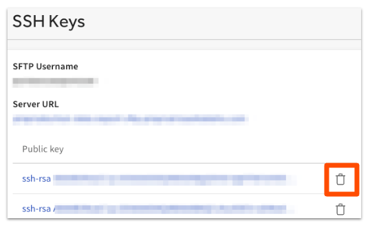 If your public key is compromised, that key's access can be revoked by selecting the Delete icon next to the public key list and generating a new key to add to Toast Web.