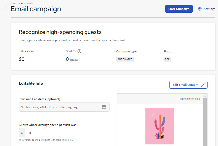 | Big Spender | Targets guests with a higher than average spend at your restaurant to share a thank you message or special offer. Simply set your custom threshold and emails will be sent to guests whose check average exceeds it. |