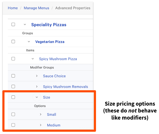 When you use the size pricing strategy, the item sizes that you define (like "Small," "Medium," "Large") will appear on the Advanced properties menu editor in the same place that your modifier groups do, but it's important to note that item sizes do not function like modifiers.
