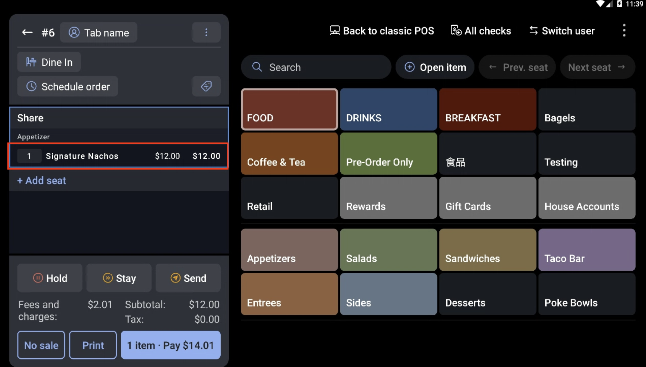 To change the dining option of a single item, use the steps below. Changing the dining option for the entire check or ticket will cause the table number on the ticket to disappear, so we recommend following these steps instead.
