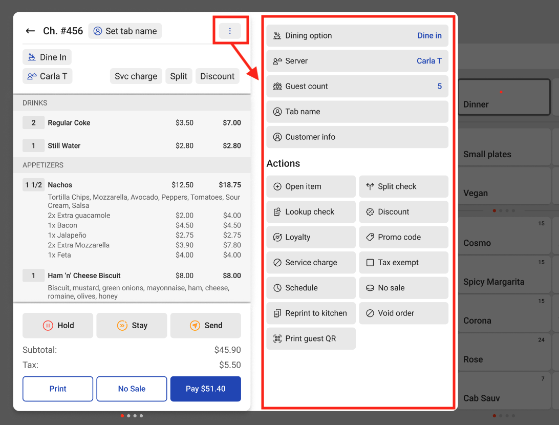 Certain check actions can be found in the check overflow menu. The overflow menu is the three vertical dots located in the top right corner of your check on the POS. In this menu, you can split a check, apply a discount and more as seen in the image below.