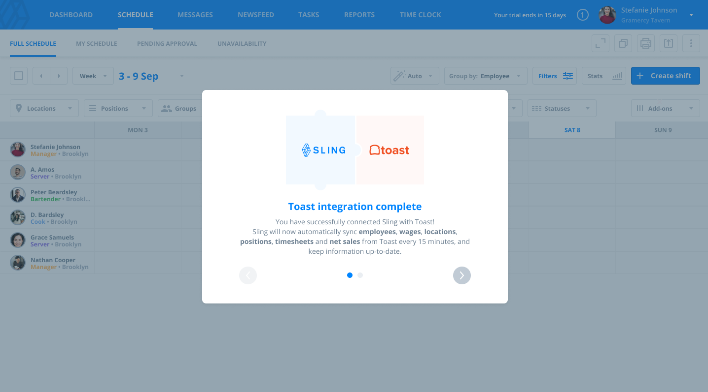 Sling integrates with Toast to sync employee, scheduling, and operational data between platforms. The available functionality depends on whether you use Scheduling Lite or Scheduling Pro.