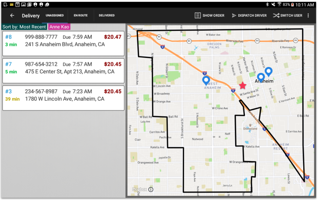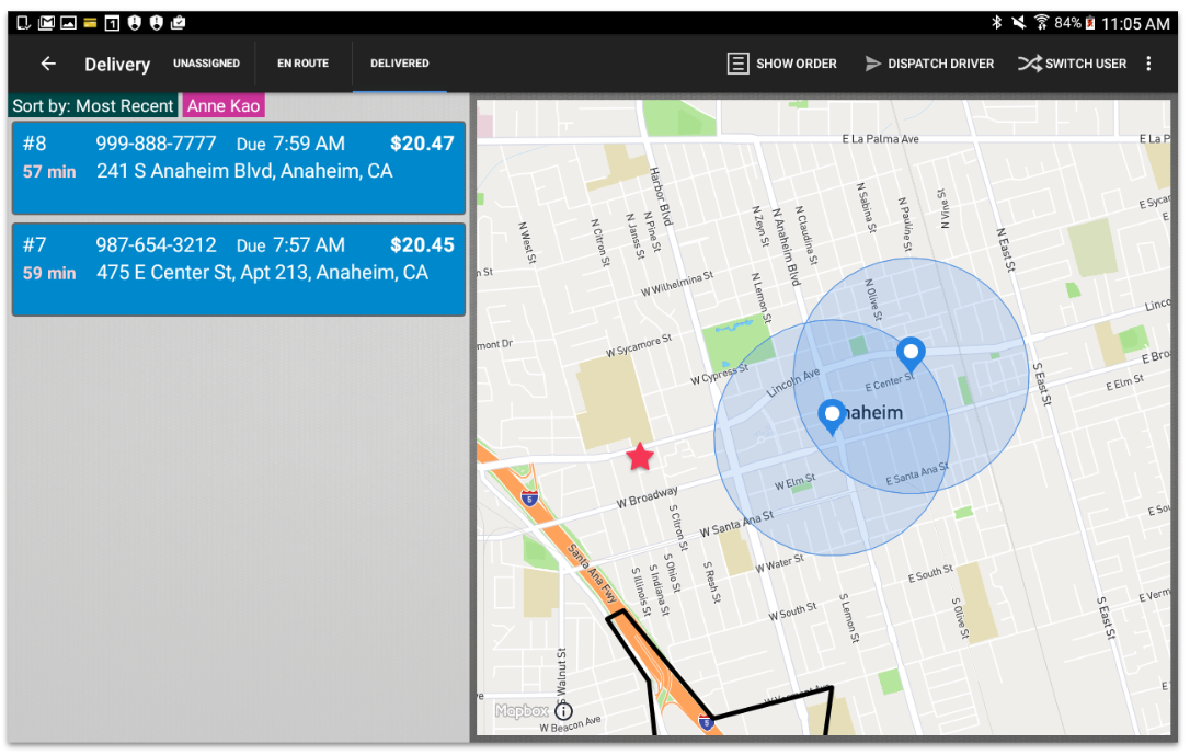To zoom in or out on the map, simply pinch the screen and drag. In the following example, two orders have been zoomed in.