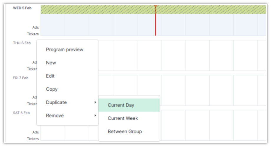 You can now copy the schedule to multiple days by right-clicking on the Scheduling menu options button and selecting Duplicate.