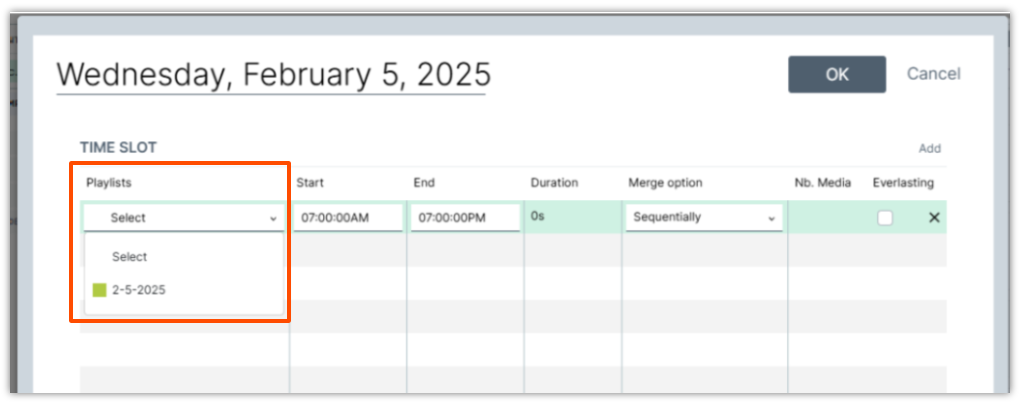 Set the Start and End times or select Everlasting if you want this Playlist to play at all times. The picture below shows that the Playlist is scheduled for one day.