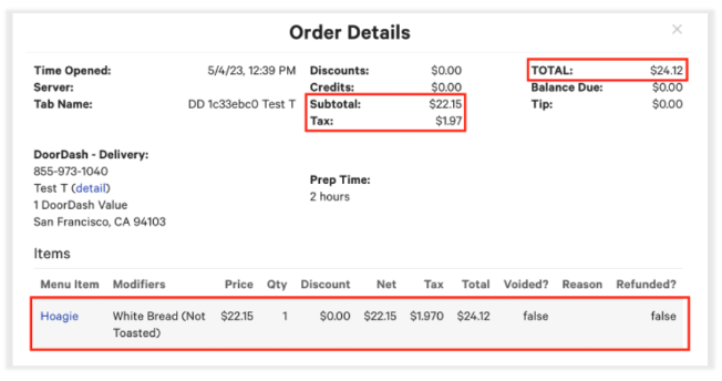 Customers will now see DoorDash orders within the Toast POS in the below format, where the price and subtotal reflect the item's price configured on DoorDash if you are using Menu Hub to inflate/deflate prices. Tax will also be populated with the tax amount calculated by DoorDash.