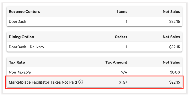 Additionally, with the update, the values calculated within Sales Summary in Toast Web for Net Sales for the relevant DoorDash revenue centers and dining option will reflect the price of the item configured on DoorDash. Since DoorDash is now transmitting tax amount for the order, the Tax Rate section shows a new field named Marketplace Facilitators Taxes Not Paid, which displays the tax amount calculated by DoorDash:
