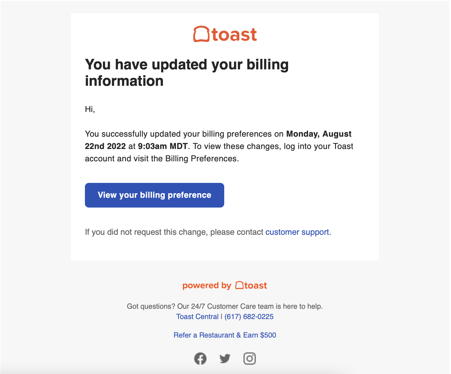 The financial contact for a location will automatically receive an email whenever any billing preferences are adjusted.