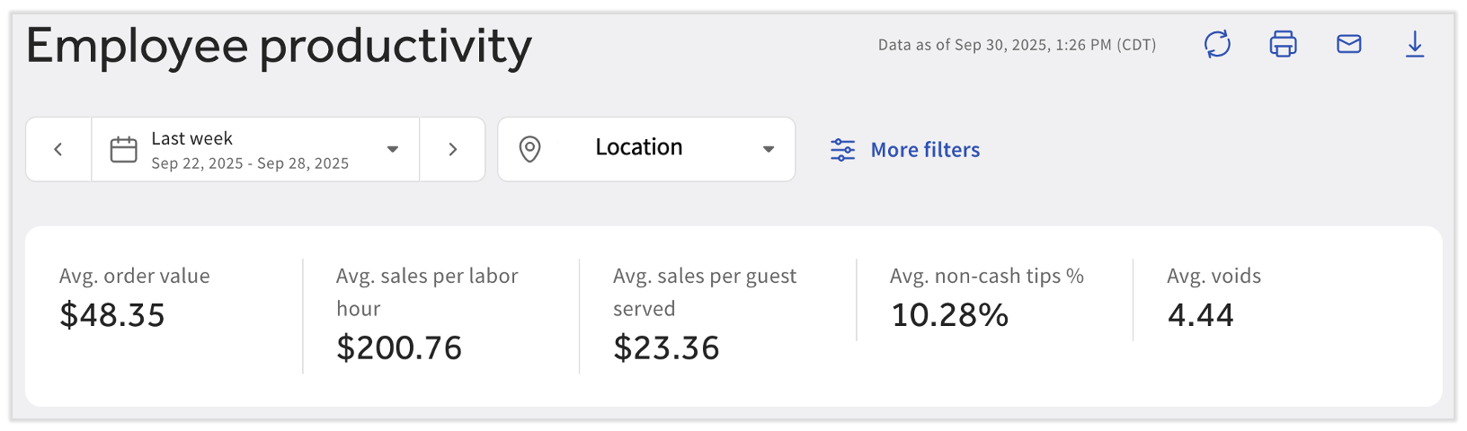 At the top, two drop-down menus should be set each time you view this page. The first drop-down menu is your date selector and the second is your location selector. In addition, you can select the More filters button to add in revenue centers, service areas, dining options, and other options.