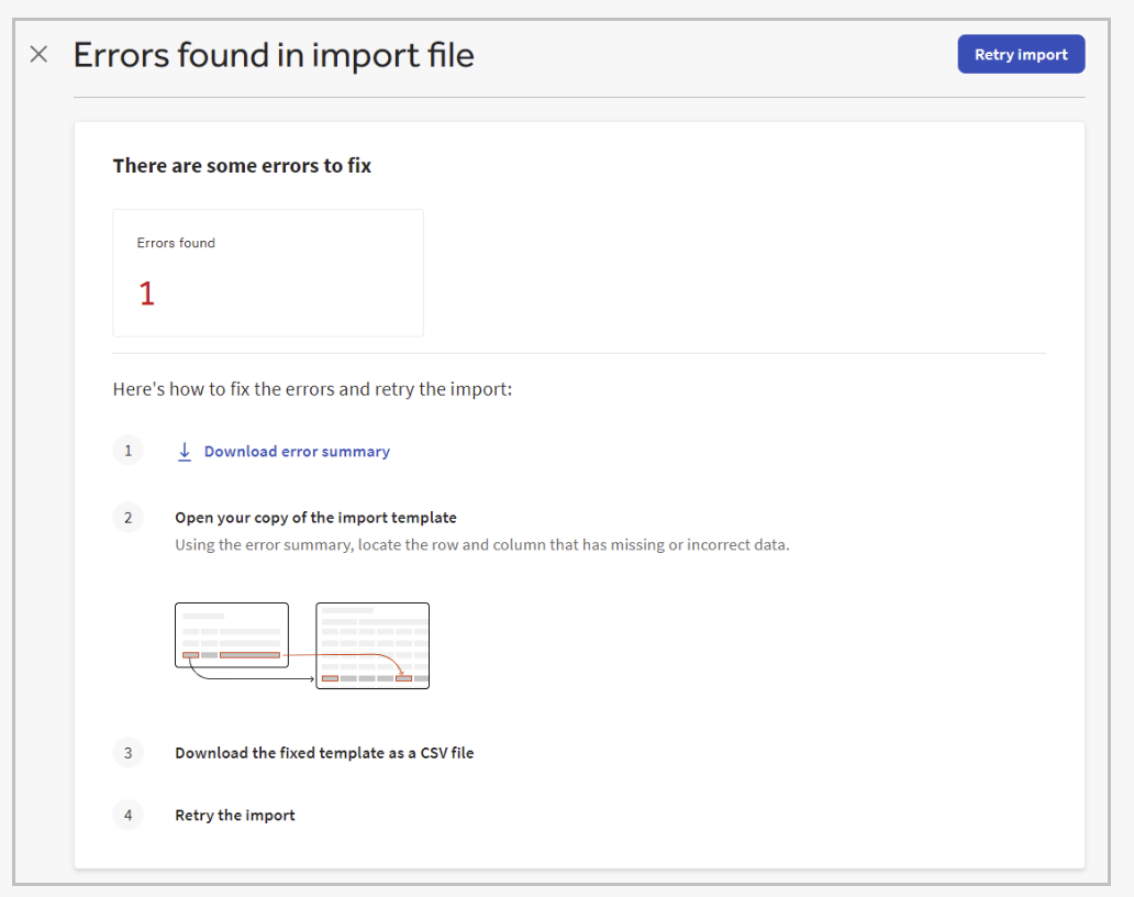 Both the Errors found in import file and the Incomplete import page have a Download error summary link. You use this link to download a CSV file that contains information about the errors in the import file. The CSV contains a row for each error encountered during the import attempt.