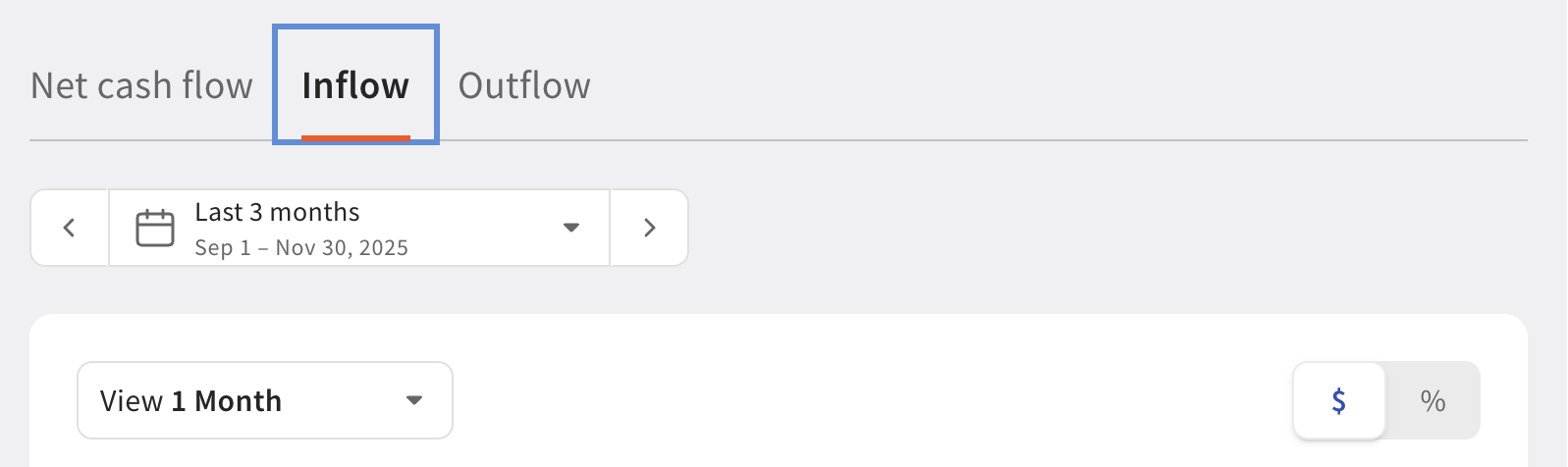 Your inflow and outflow reports contain the same one week, two week, and one month dropdown as seen in the Net cash flow report for easy review within your set date window.