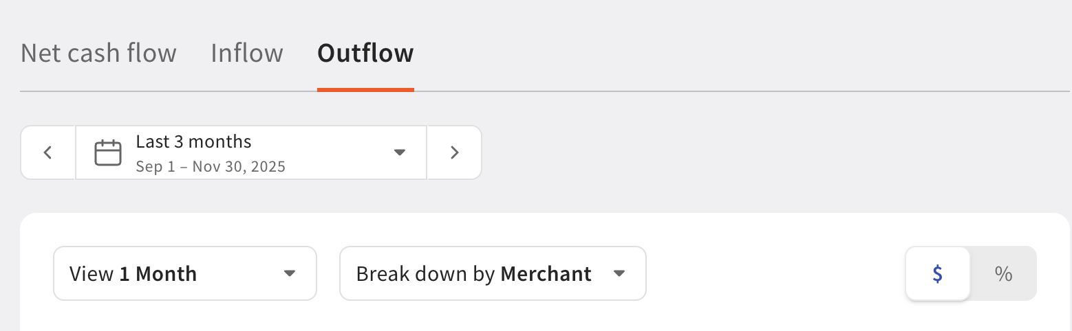 The outflow report can also be viewed by dollar amount or percentages, but can be broken down even further by allowing you to review your cash outflow by merchant, or by transaction category.