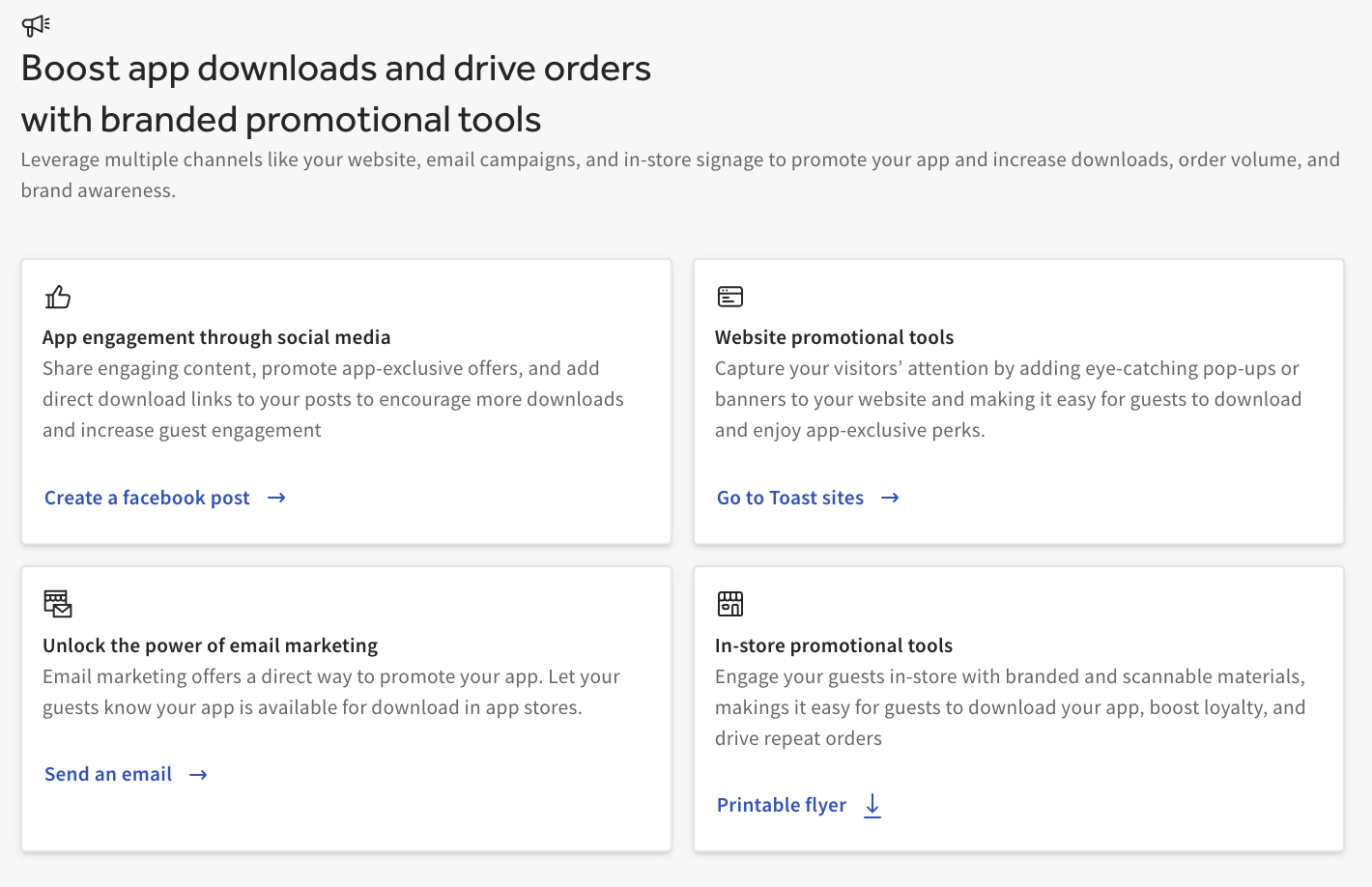 Leverage multiple channels like your website, email campaigns, and in-store signage to promote your app and increase downloads, order volume, and brand awareness.