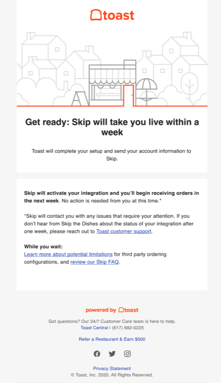 | Toast sends your account information to Skip for them to activate. |