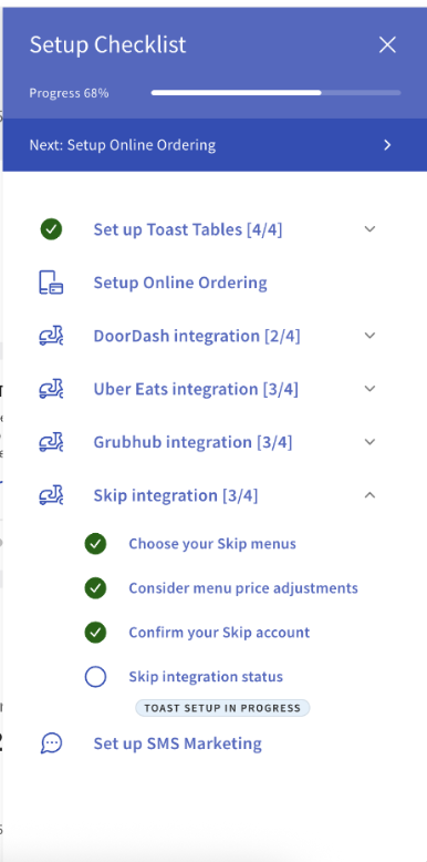 You can easily access the setup steps in Toast Web when you log in. A checklist at the bottom right of your screen will pop up, and there will be a line item for the integration setup.