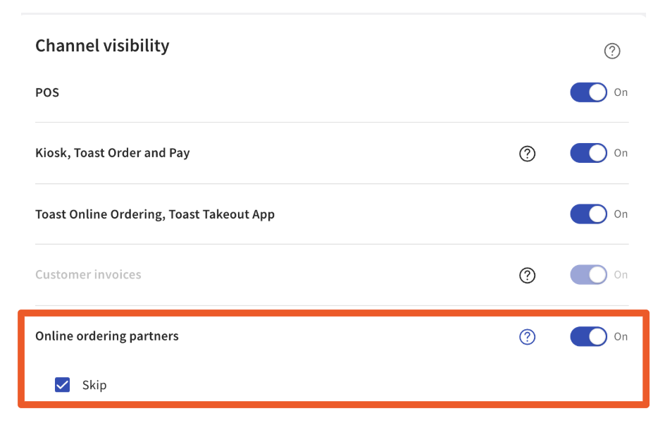 Once you are live on the integration, you should make ALL menu changes in Toast, NOT on the Skip portal. Menus with visibility set to Online Orders: Ordering Partners are shown on Skip and the other online ordering partners you may use. For more information on changing your menu's visibility settings, check out .