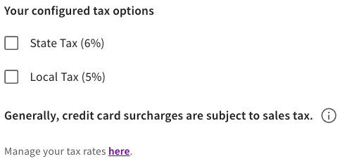 Note: As required under card brand rules, Toast’s surcharging solution does not apply surcharges to debit, prepaid, or gift card transactions (or any payment method other than credit cards).