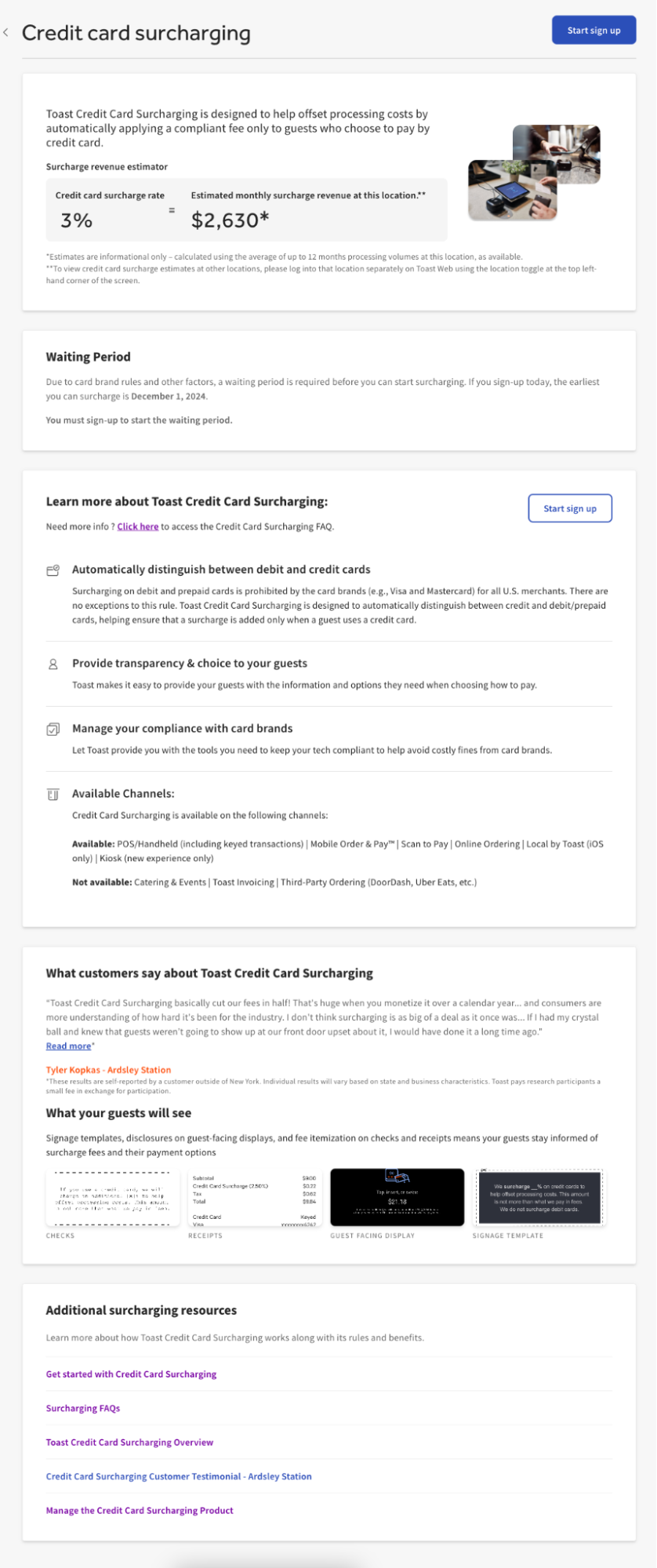 The Credit Card Surcharging product offered by Toast allows you to automatically surcharge credit card transactions in eligible U.S. states to help offset the cost of your credit card processing fees. Toast Credit Card Surcharging is a solution designed to follow card brand surcharging rules and help you apply surcharges automatically to your guests’ credit card transactions in a way that complies with the rules.