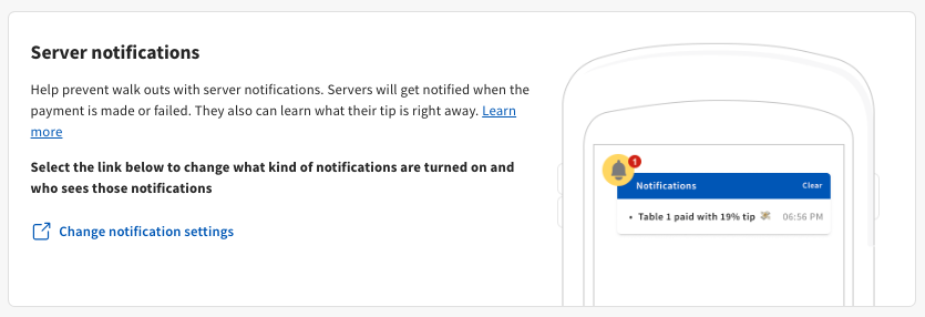 Menu item reviews, POS notifications, tip settings, and the restaurant logo at the top of the guest experience can all be configured. See more details in the section.