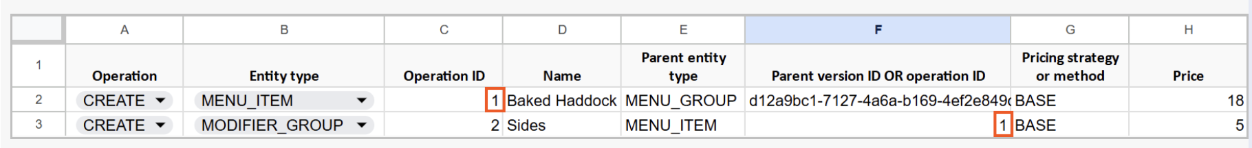 You must provide a unique operation ID for every row in a bulk import spreadsheet. A row's operation ID allows other rows in the spreadsheet to attach to it. For example, consider a row that creates a new menu item called Baked Haddock. Another row creates a new modifier group called Sides that needs to attach to the Baked Haddock menu item. Attachments are done by specifying the Toast GUID of the parent menu entity to be attached to, but because the Baked Haddock menu item doesn't exist in the Toast platform yet, it does not have a Toast GUID associated with it. Instead, the Sides modifier group row must use the operation ID for the Baked Haddock row as the ID of the parent menu entity to attach to.
