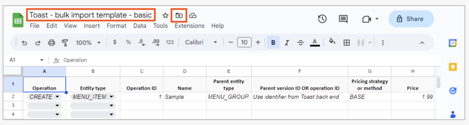 | Modifier owner ID | If the menu item the row is specifying will be used as a modifier option's item reference, you can override the item reference's owner location group GUID with one that is used for the modifier option only. For more information, see the advanced template in this article. For more information, see Specify Toast identifiers. | Used for CREATE operations where Entity type is MODIFIER and you want to override the item reference owner Empty for all other operations Column can be omitted from spreadsheet if empty for all rows |