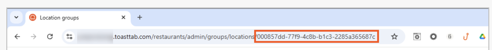 To see identifiers for locations and location groups (formerly called restaurant groups), Toast support must enable the multi-location management product module for your restaurant locations. When this module is enabled, the Toast account > Business and location management > Location groups (Restaurant groups) page becomes available in Toast Web. You can retrieve a location or a location group's identifier from this page, using the instructions below.
