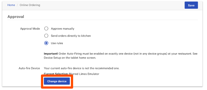 You can view which device is selected as their autofire device from the Approval section on the Online Ordering page in Toast Web.
