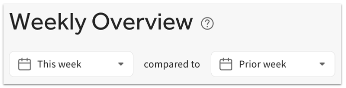 At the top of the report, you can select either This week or Last week from the filter drop-down. Additionally, the dashboard has the ability to compare performance metrics to the prior week, the same week last year, or the same week 2 years ago.
