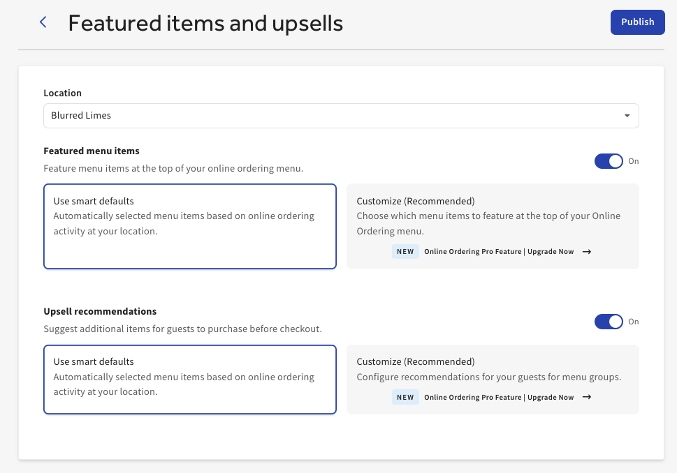 If you use the Smart Defaults option, the feature items or upsell recommendations will automatically be selected based on online ordering activity. If you select customize, you can manually select any items on your menu for feature.