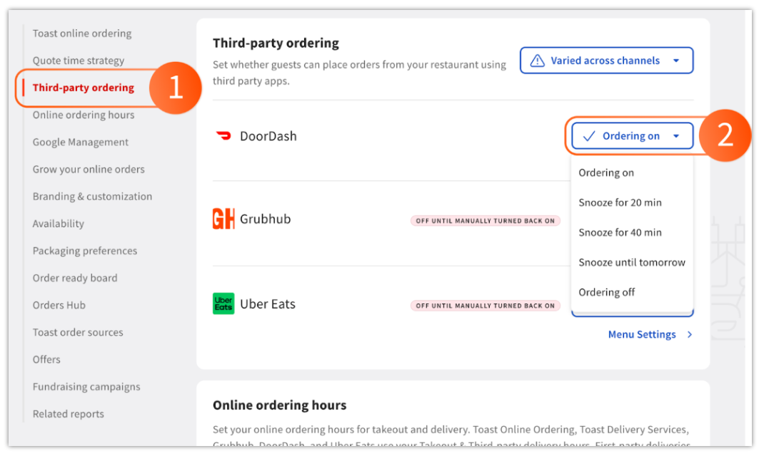 | Snoozing is only available for orders placed through Toast Online Ordering, Toast Delivery Services, or for GrubHub, DoorDash, or UberEats integrations. For all other providers, visit your applicable third-party delivery support for available options for your restaurant. |