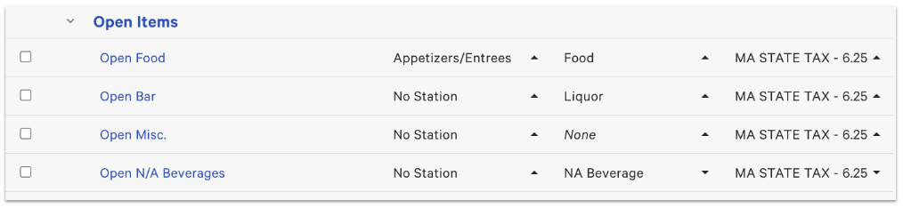 If you have open items on your menus (e.g. Open Food, Open Bar, Open Misc.), then all of the settings mentioned above (sales categories, tax rates, prep stations) should be assigned to those items as well. Use the advanced properties page to expand your menus and view all of these settings at once, or open a specific item's details page to see all available settings at a glance.