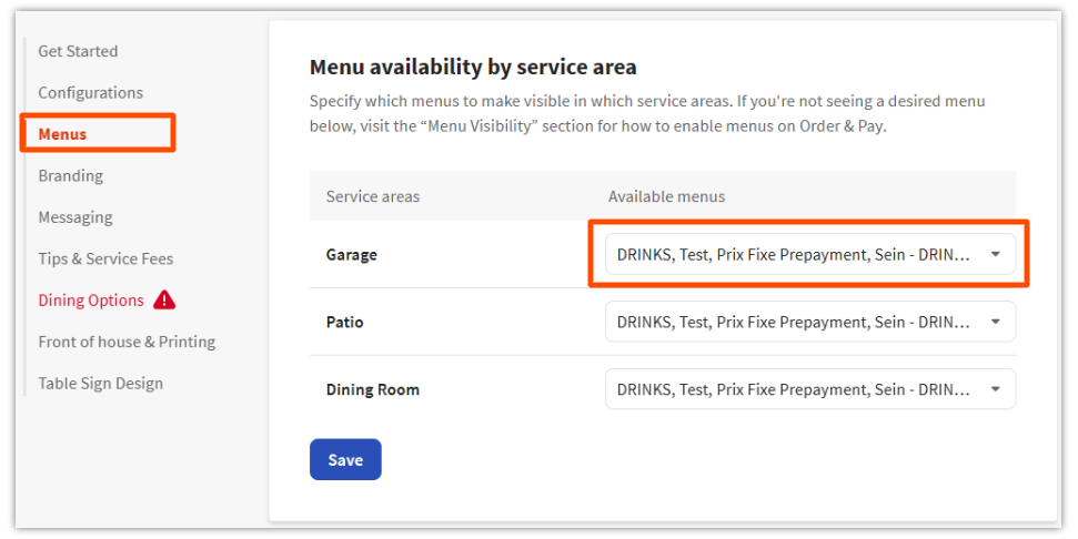 With Menus by Service Area, configure each service area to display only specific menus on Order & Pay™. For example, you might only offer Drinks on the Patio, but Food and Drinks inside. This feature enables you to expand Order & Pay to new spaces in your venue and grow sales.