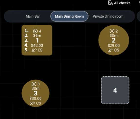 Each table has the table number inside a shape that matches the table shape with the color of the current dining status, and has the server assignment, order preview, table timer, and order total. If you select a table in the details pane or a table on the floor plan while the details pane is open, you will open the check details for the table.