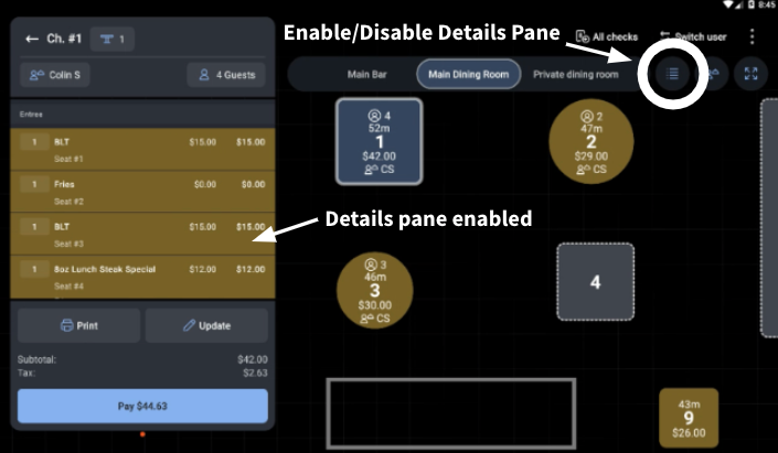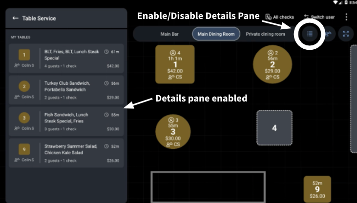 The details panel will display the table’s check details. You can enable or disable the details pane with the button shown in the top right. It will appear on the left side of the Table Service screen and show different information on whether a table is selected or not.