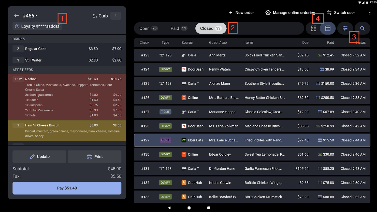 First, let's review the features of your POS payment screens (also commonly referred to as payment selection screens). This section covers all features of the screens you use to collect payments and close active orders on your POS.