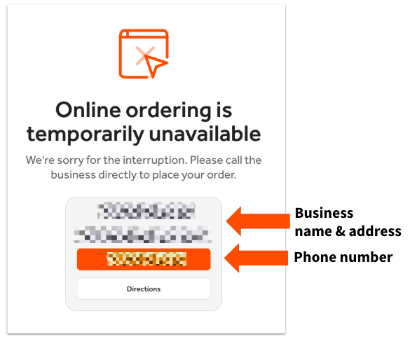 If a guest who placed an online order calls the restaurant, take this opportunity to explain the offline issue to guests. They may wish to cancel their online order, but keep in mind you can still take their order information over the phone and place the order on the POS. However, if your restaurant uses Toast Delivery Services® where you utilize DoorDash Drive or Uber Eats drivers for your delivery, keep in mind that DoorDash Drive and Uber Eats will not receive any orders.