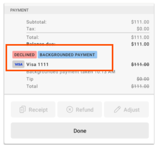| Declined | The guest's card was not processed successfully (What can I do if a guest's card is declined?). For payments stored in the background during offline mode, the card payment used while offline was declined after your Toast POS device reconnected. |