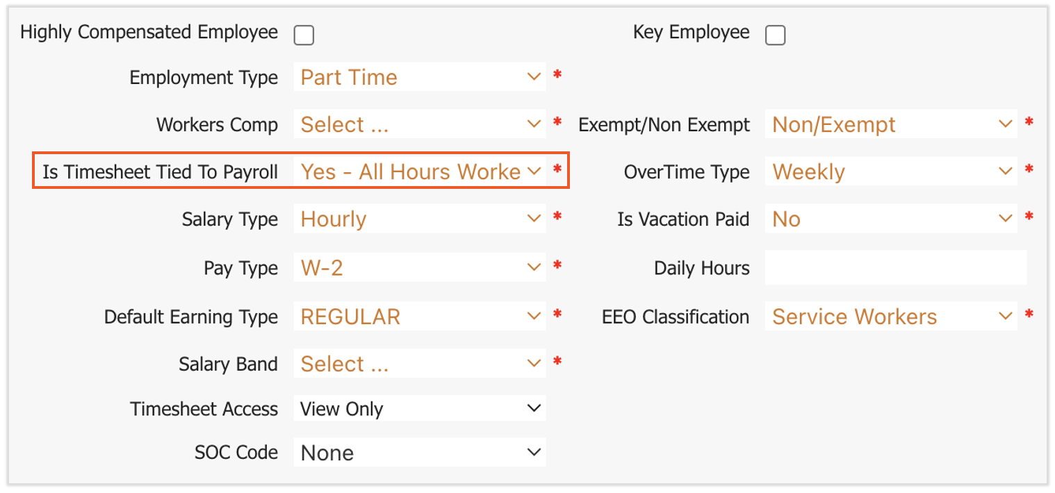 With this setting as No, even if a salaried employee's timesheet is approved, their hours won't be pushed to the payroll process. If this setting is marked as any of the three Yes options, approved timesheet hours could flow to payroll and could lead to additional earnings on top of the employee's regular salary.