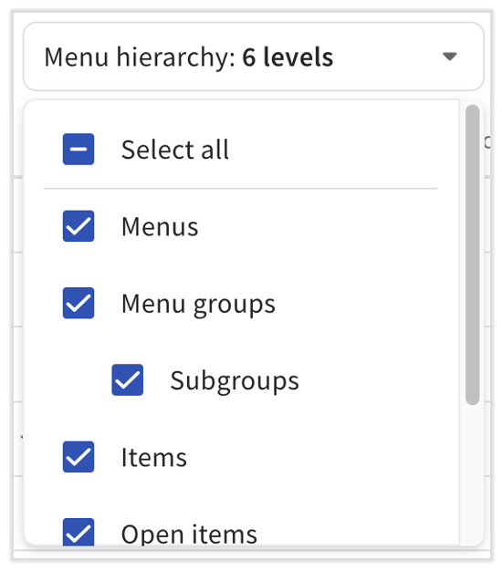 For example, in the report below, four menu levels (Menus, Menu groups, Subgroups, and Items) were selected from the drop-down: