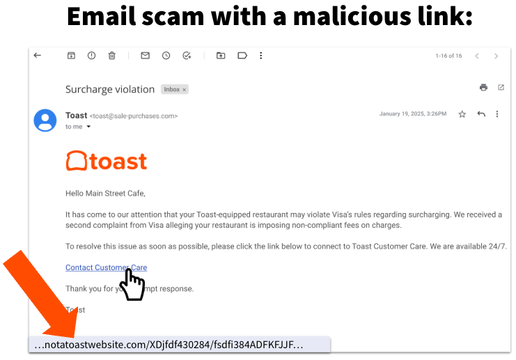 Some email scams can be very sophisticated. While the example below may look like an official Toast email at first glance, you can see that the sender's email address is coming from a domain called "sale-purchases" (not an official Toast domain), and if you hover your cursor over the link in the email you would see that the URL is not a Toast website.
