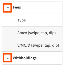Underneath the summary section is a breakdown table that shows detailed information related to the refunds, fees, and withholdings for the payout. Select the caret (arrow) icon next to Fees or Withholdings to expand the table for more details.
