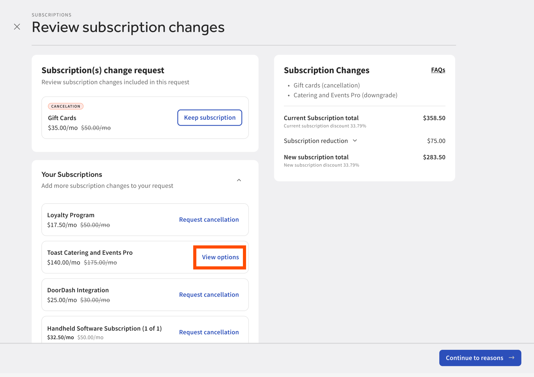If you do not see the option to respectively downgrade or downsell the desired package or subscription, please reach out to Toast Support.