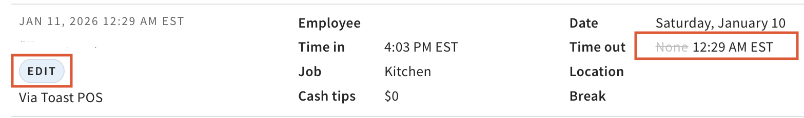 Note: The blue EDIT tag will always be displayed for employees who clock out on the POS because their time out value updates from None to a recorded clock-out time as seen in the image below.