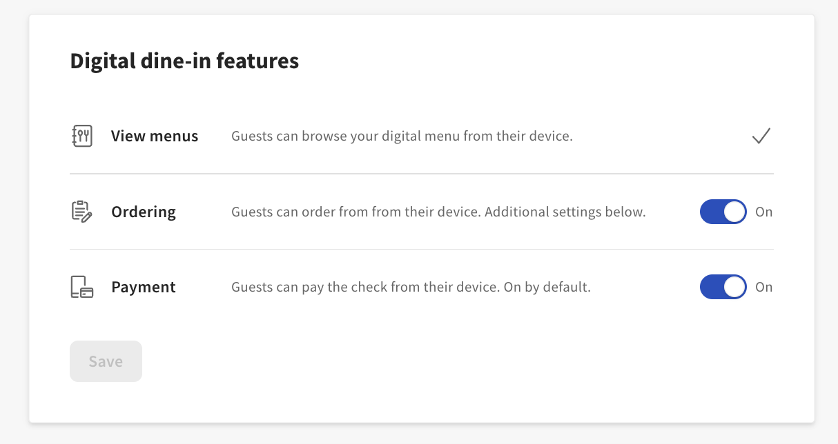 By putting your guests in control of their dine-in experience, Toast Mobile Order & Pay® can help you reduce your labor costs, improve table turn times, and increase sales. All while offering your guests a safer and more efficient way to dine in your restaurant. Navigate to Toast Shop to add Toast Mobile Order & Pay® now!