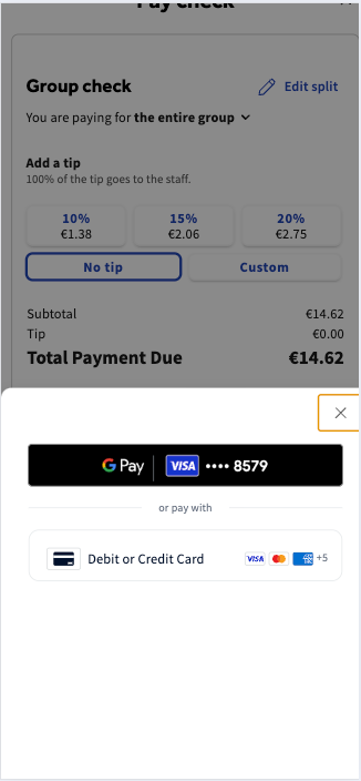 Yes, GPay™ can be used as a form of payment for split payments. Once the QR code is scanned on the receipt, guests can select Google Pay™ as their payment type and proceed with checkout. The below images show the experience for US based guests.