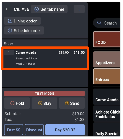 As we navigate back to the order screen, we see that the Carne Asada is now added to the order.