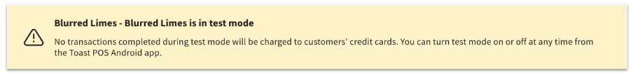 If you enable Test Mode from a device in your restaurant, it will put your entire restaurant in Test Mode. Test Mode cannot be isolated to a single device. We strongly discourage enabling Test Mode during your service hours at the risk of losing orders and payment data across your restaurant. If you're using it to train employees, it's critical to disable Test Mode when you are finished with training.