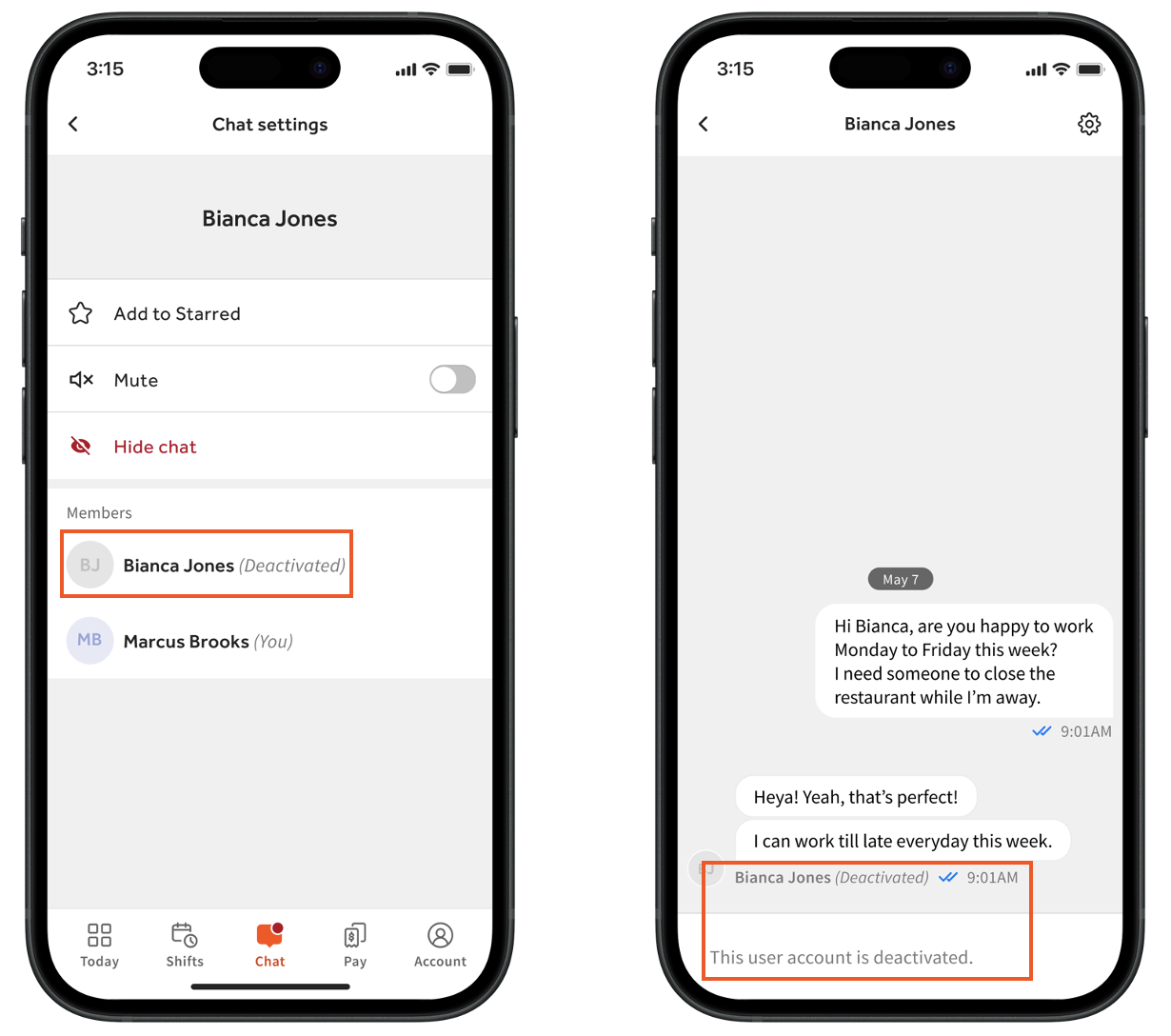Once an employee is archived in Toast Web (or Toast Payroll, if your restaurant uses it), the Chat tab of the MyToast app will become unavailable (terminated employees will only have access to the tab). Terminated employees cannot view or send any messages. Furthermore, other employees and managers will be unable to send direct messages to the terminated employee, which will be denoted by the Deactivated label beside their name as seen in the images below.